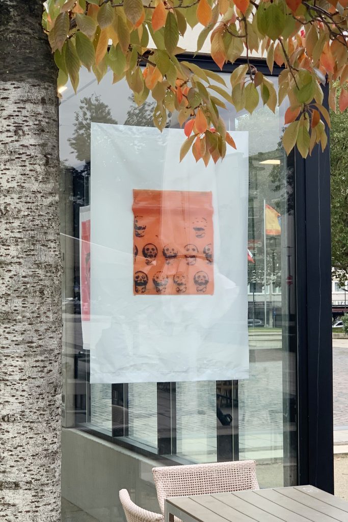 Schon beim Aufbau, beim Hängen der vom Unternehmen wirmachendruck-punkt-de bedruckten 210gr-Banner in den Maßen 150 mal 100 Zentimeter, die die von mir durchaus langwierig gesammelten und gescannten dime bags zeigen, also kleine Drogentütchen, Gras, Pillen, Pulver, bleiben vereinzelt Leute, die den großen Marktplatz überqueren, stehen, und schauen. Männer, junge Männer, die, so sagen ihre Gesichter, sehen worum’s geht, Hände in den Taschen, ein kuzer Blick ehrlicher Aufmerksamkeit. Das bedeutet mir was. Diese drei, vier Sekunden sind mehr als die automatisierte Aufmerksamkeit von routinierten Kunstbetrachtercrowds. Da ich wirklich gerne kommunikativ bin mit dem, was ich ausstelle, lebe ich auch mit einer gewissen Genügsamkeit, bzw. einem Wissen darüber, dass man nicht ständig zu a l l e n hinkommunizieren kann. Diesmal wollte ich wirklich zu denen sprechen, die, wenn ich sie kategorisieren müsste, nennen würde: die, die den Marktplatz überqueren. Ich flüstere es vor mich hin, wie einen Indianernamen. Smoke and skulls and fire.